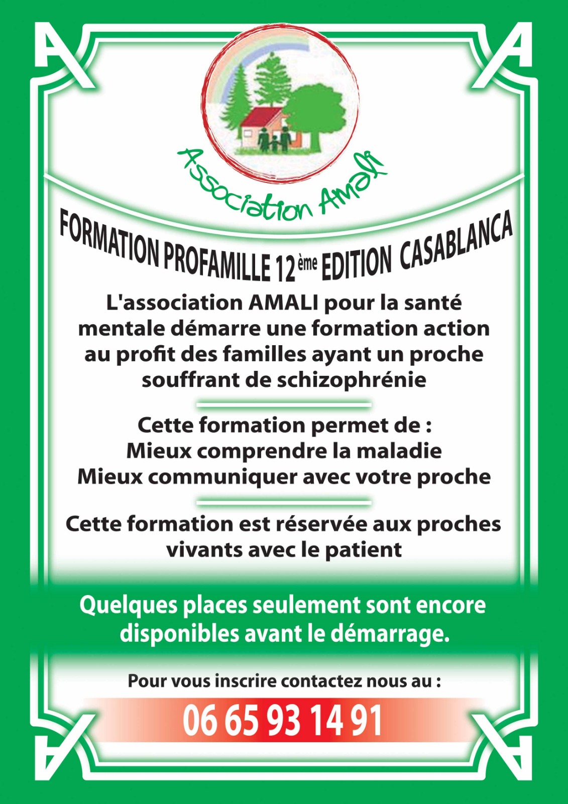 L’Association AMALI et le CPU (Centre Psychiatrique Universitaire) de Casablanca vous accompagnent à travers la formation psycho-éducative d’origine canadienne PROFAMILLE, pour une meilleure prise en charge de votre proche.